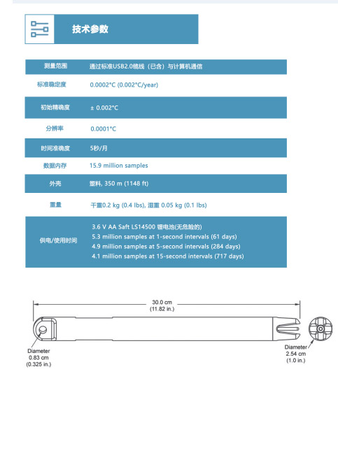 Sea-Bird Coastal Hydro-T紧用了Sea-Bird Electronics[SBE)的先进专业技术,非常适合水下温度的长期测量与记录。经过多次现场验证。Hydro温度传感器测量并记录温度,具有长期的数据稳定性。依据用户的采样就率,Hydro-T能够在电池耗尽更接之前采集高质量数据达到1月到2年。